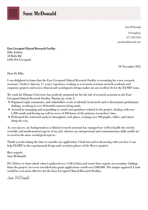 Research assistant roles often support principal investigators or larger research teams. Employers seek candidates who blend technical expertise with qualities such as precision, organisation, teamwork, and initiative. Including a tailored cover letter alongside your CV shows you’re serious, thorough, and willing to go the extra mile, just as in any good research project.