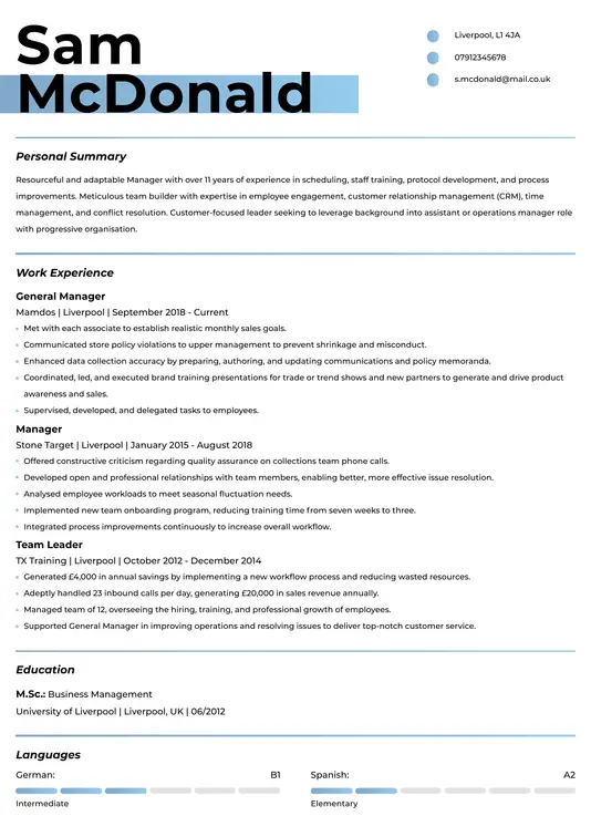 A CV template for an inexperienced candidate should emphasise transferable skills and meaningful and relevant accomplishments. Bring those CV sections to the top of your document for greater impact. Our LiveCareer CV builder will guide you through the entire process. Just indicate that you haven’t written a CV before or have zero experience.